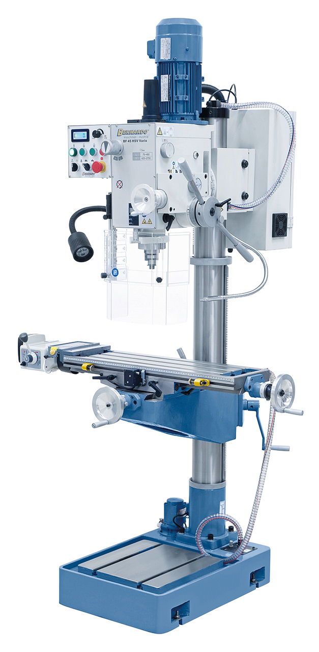 A BF 45 HSV Vario fúró- és marógéppel lehetősége nyílik horizontális, vertikális és ferde síkú fúrási és marási munkálatok elvégzésére. A kompakt felépítés, a sorozatszerű orsóhüvely-előretolás, a digitális szegnyereg-emelkedés mutató és a fokozatmentes fordulatszámbeállítás által ez a modell ideális megoldást nyújt modellkészítők, kézművesek és szerelőműhelyek számára.