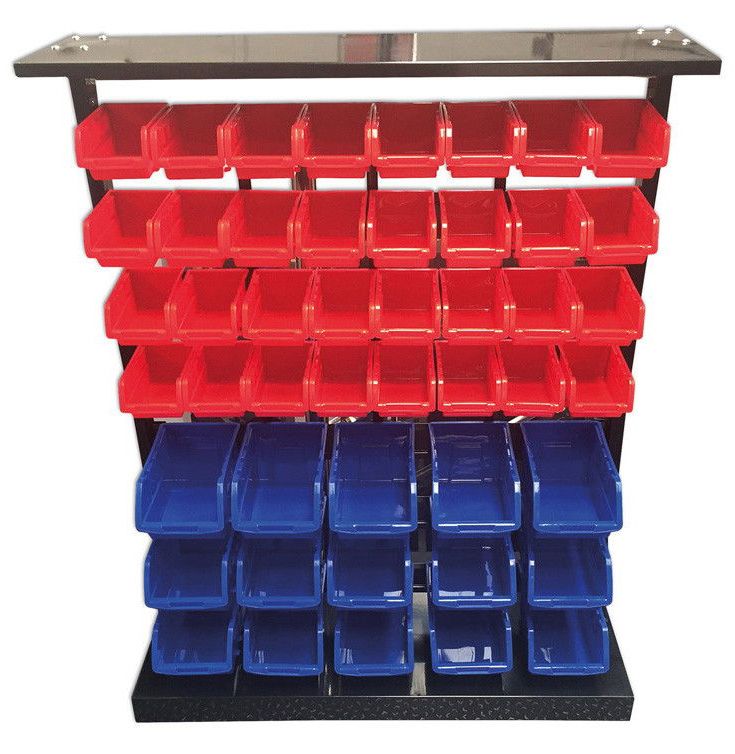 Ideális szerszámtartó, a profi műhelyberendezések elengedhetetlen szortimentje, piros és kék tárolódobozokkal kiegészítve.
